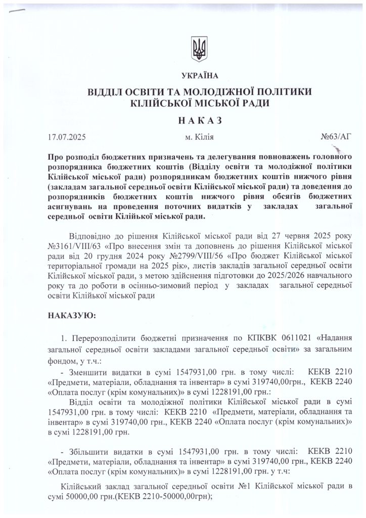 Про розподіл бюджетних призначень та делегування повноважень головного розпорядника бюджетних коштів (Відділу освіти та молодіжної політики Кілійської міської ради) та доведення до розпорядників бюджетних коштів нижчого рівня обсягів бюджетних асигнувань на проведення поточних видатків у закладах загальної середньої освіти Кілійської міської ради
