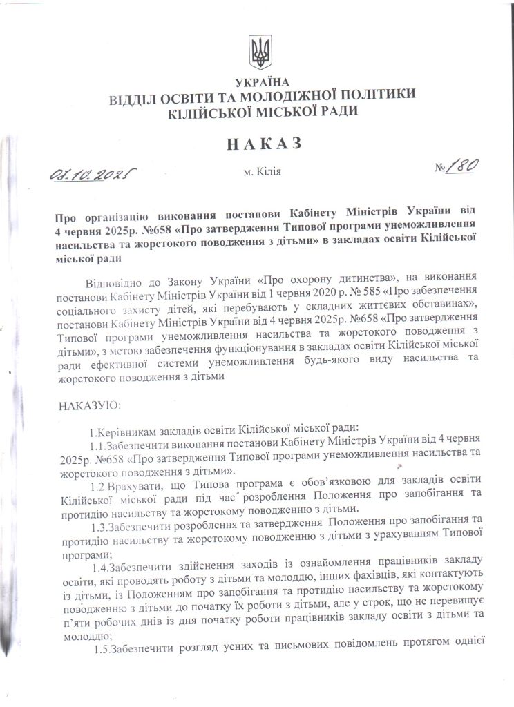 Про організацію виконання постанови Кабінету Міністрів України від 4 червня 2025р. №658 “Про затвердження Типової програми унеможливлення насильства та жорстокого поводження з дітьми” в закладах освіти Кілійської міської ради 07.10.202507.10.2025