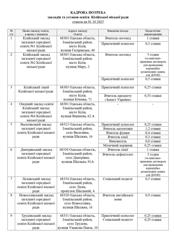 Кадрова потреба закладів та установ освіти Кілійської міської ради станом на 01.10.2025 07.10.202507.10.2025