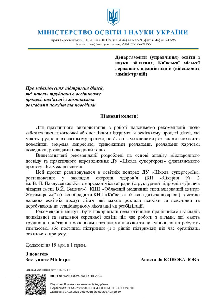 Про забезпечення підтримки дітей, які мають труднощі в освітньому процесі, пов’язані з можливими розладами психіки та поведінки 07.10.2025 Рекомендації щодо забезпечення підтримки в освітньому процесу дітей, які мають труднощі в освітньому процесі, пов’язані з можливими розладами психіки та поведінки