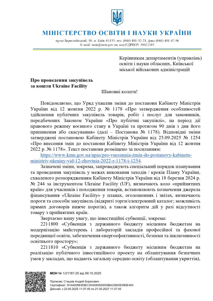 Про проведення закупівель за кошти Ukraine Facility 13.10.202513.10.2025 Текст постанови за посиланням: https://www.kmu.gov.ua/npas/pro-vnesennia-zmin-do-postanovy-kabinetu-ministriv-ukrainy-vid-12-zhovtnia-2022-r-1178-i-1254