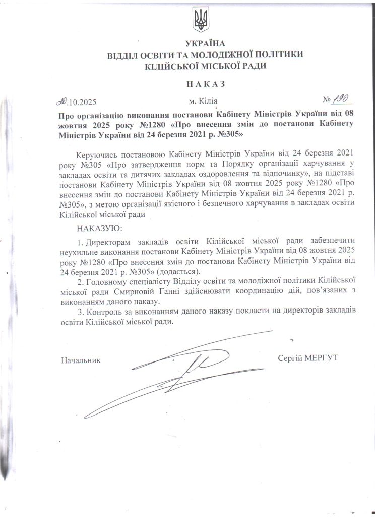 Про організацію виконання постанови Кабінету Міністрів України від 08 жовтня 2025 року № 1280 “Про внесення змін до постанови Кабінету Міністрів України від 24 березня 2021р. №305” 21.10.202521.10.2025