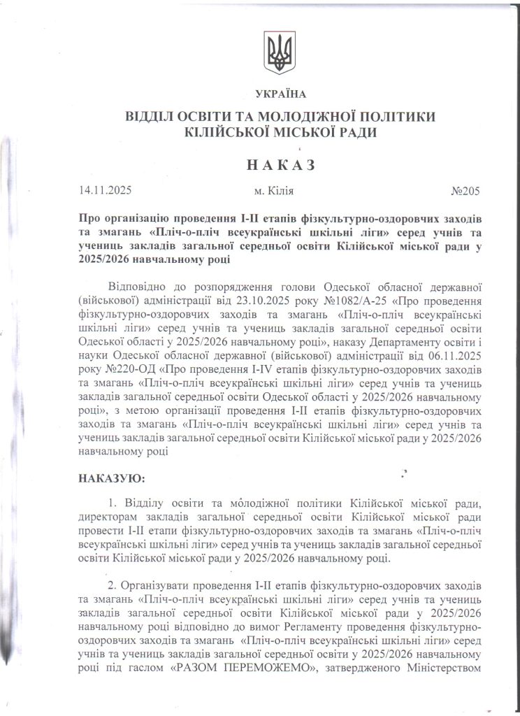 Про організацію проведення І-ІІ етапів фізкультурно-оздоровчих заходів та змагань “Пліч-о-пліч всеукраїнські шкільні ліги” серед учнів та учениць закладів загальної середньої освіти Кілійської міської ради у 2025/2026 навчальному році 17.11.202517.11.2025