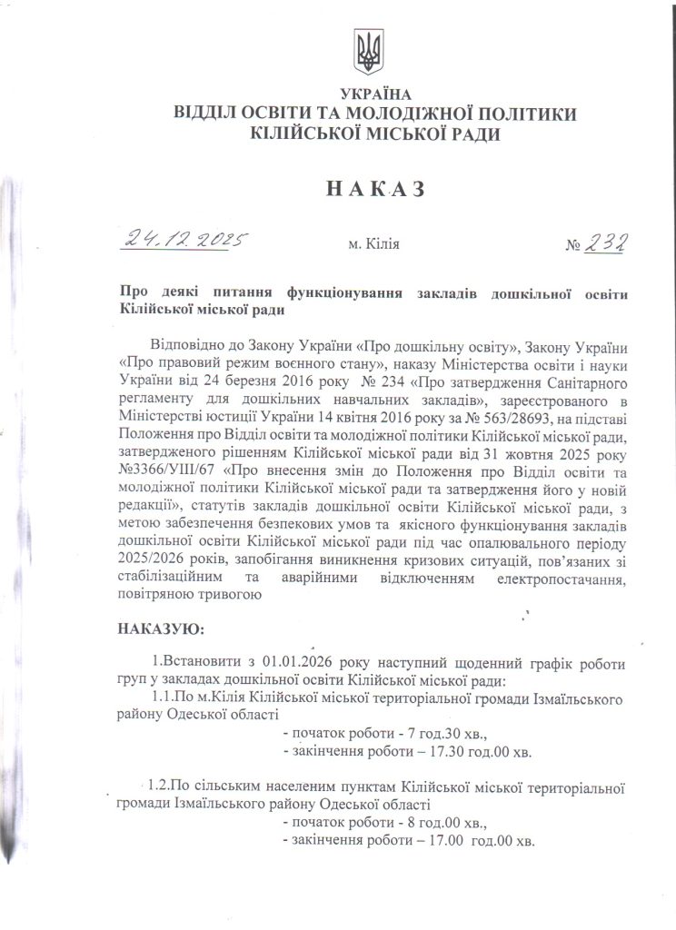 Про деякі питання функціонування закладів дошкільної освіти Кілійської міської ради