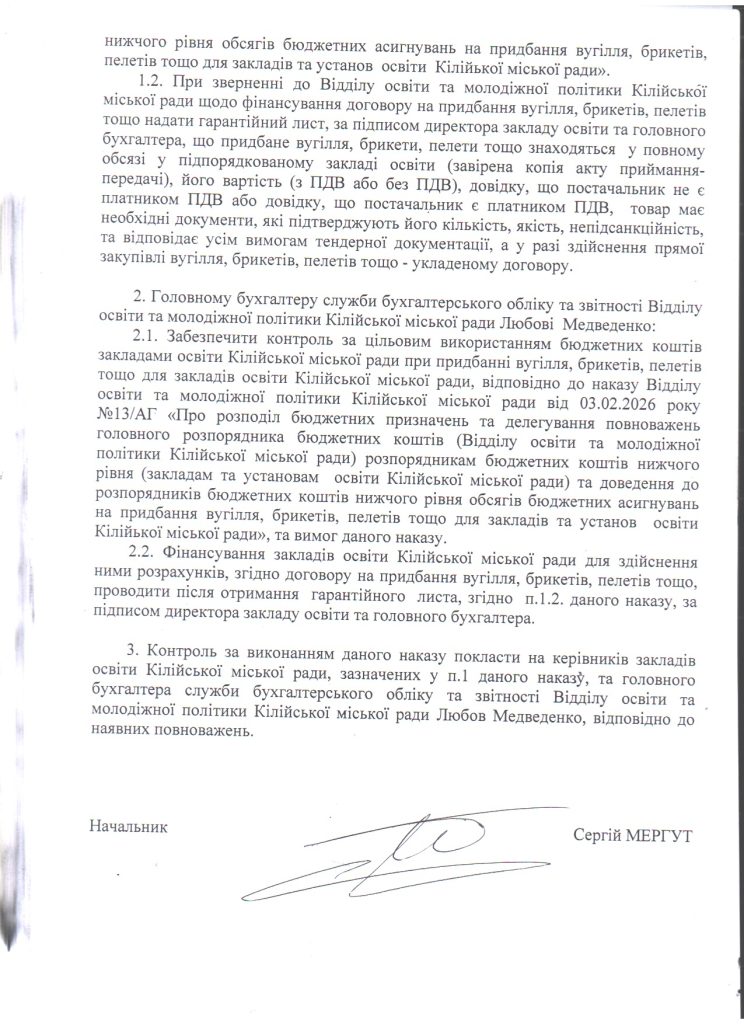 Про організаційні заходи щодо придбання вугілля кам’яного, вугільних брикетів, пелетів тощо закладами освіти Кілійської міської ради 03.02.202603.02.2026
