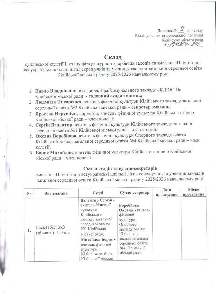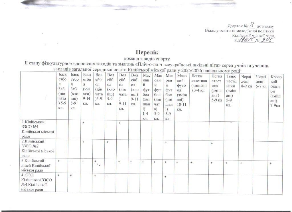 Відділ освіти та молодіжної політики > Новини > Про організацію проведення І-ІІ етапів фізкультурно-оздоровчих заходів та змагань “Пліч-о-пліч всеукраїнські шкільні ліги” серед учнів та учениць закладів загальної середньої освіти Кілійської міської ради у 2025/2026 навчальному році