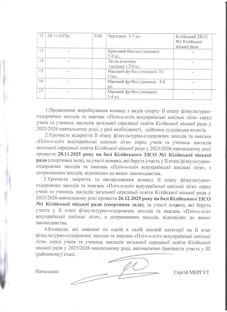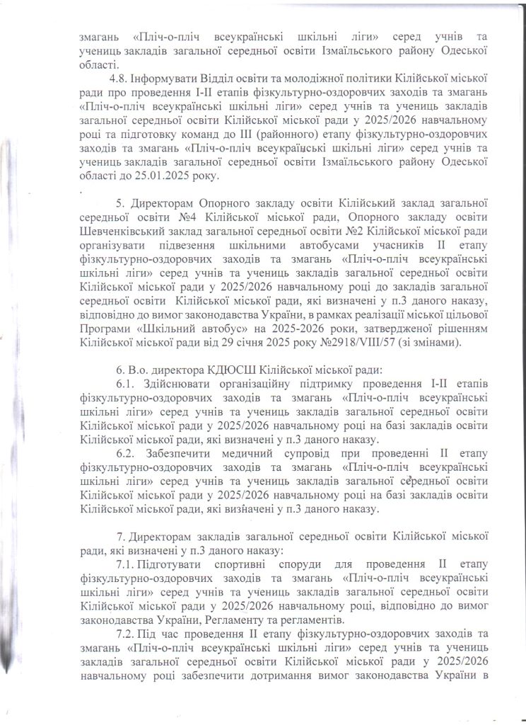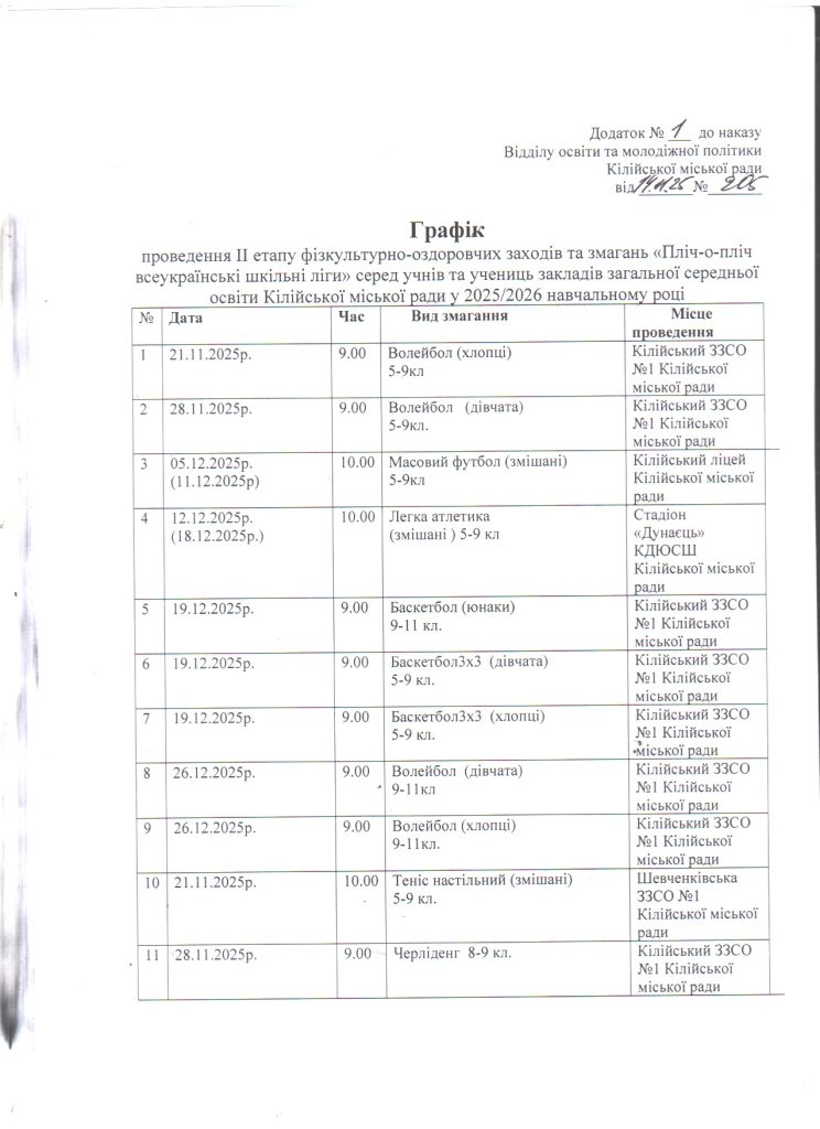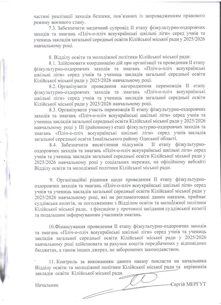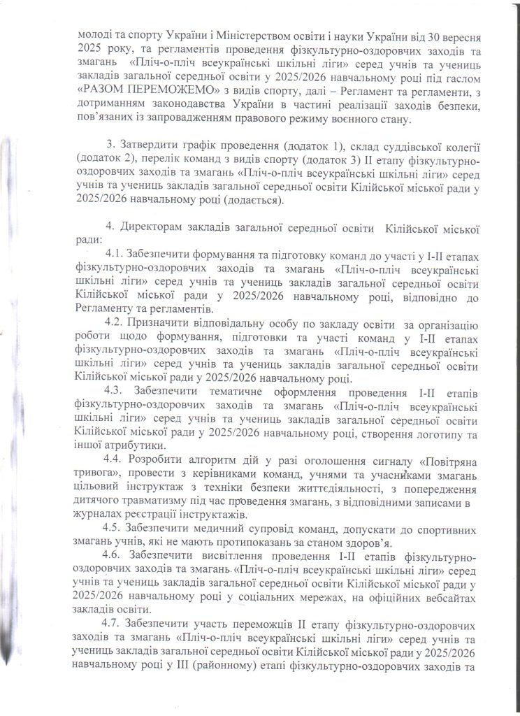 Про організацію проведення І-ІІ етапів фізкультурно-оздоровчих заходів та змагань “Пліч-о-пліч всеукраїнські шкільні ліги” серед учнів та учениць закладів загальної середньої освіти Кілійської міської ради у 2025/2026 навчальному році