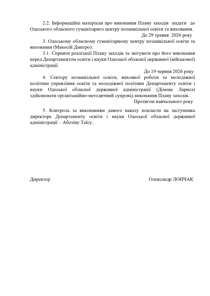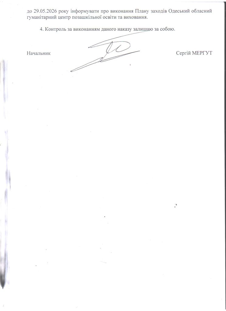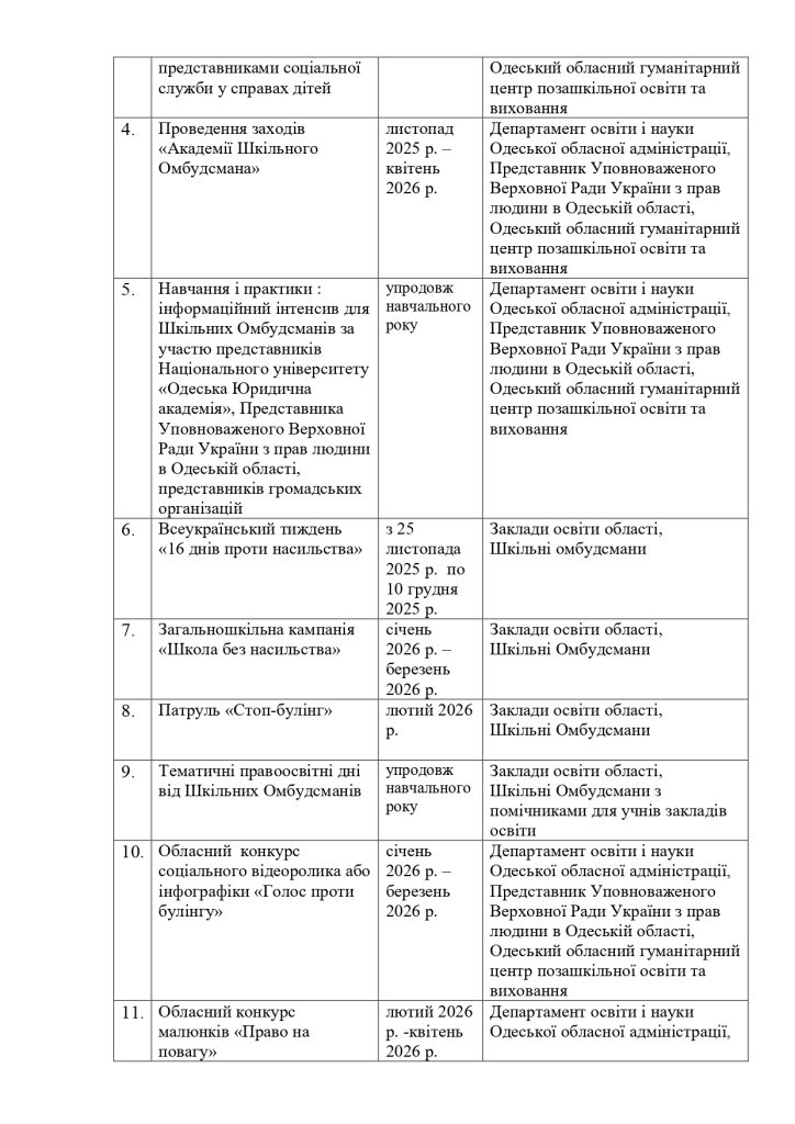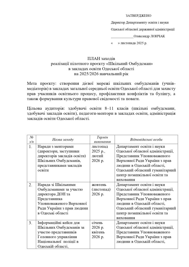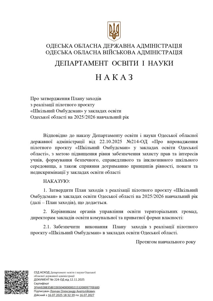 Відділ освіти та молодіжної політики > Новини > Про організацію виконання наказу Департаменту освіти і науки Одеської обласної державної (військової) адміністрації від 12.11.2025 року №224-ОД “Про затвердження Плану заходів з реалізації пілотного проєкту “Шкільний Омбудсман” в закладах освіти Одеської області на 2025/2026 навчальний рік