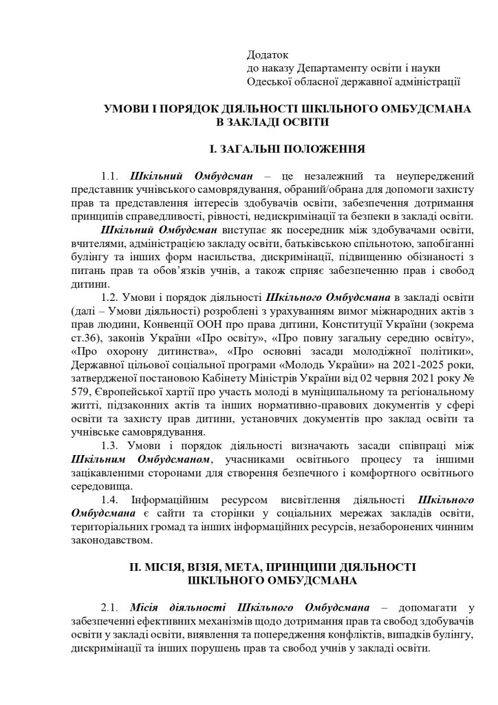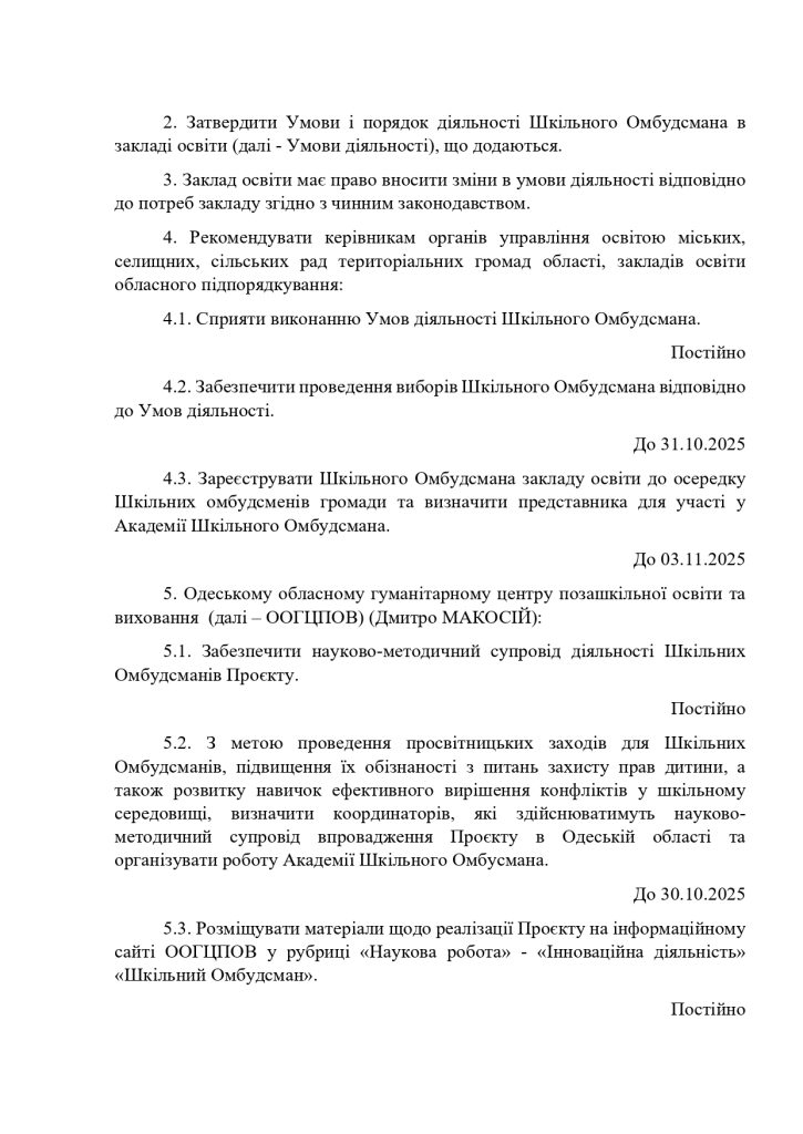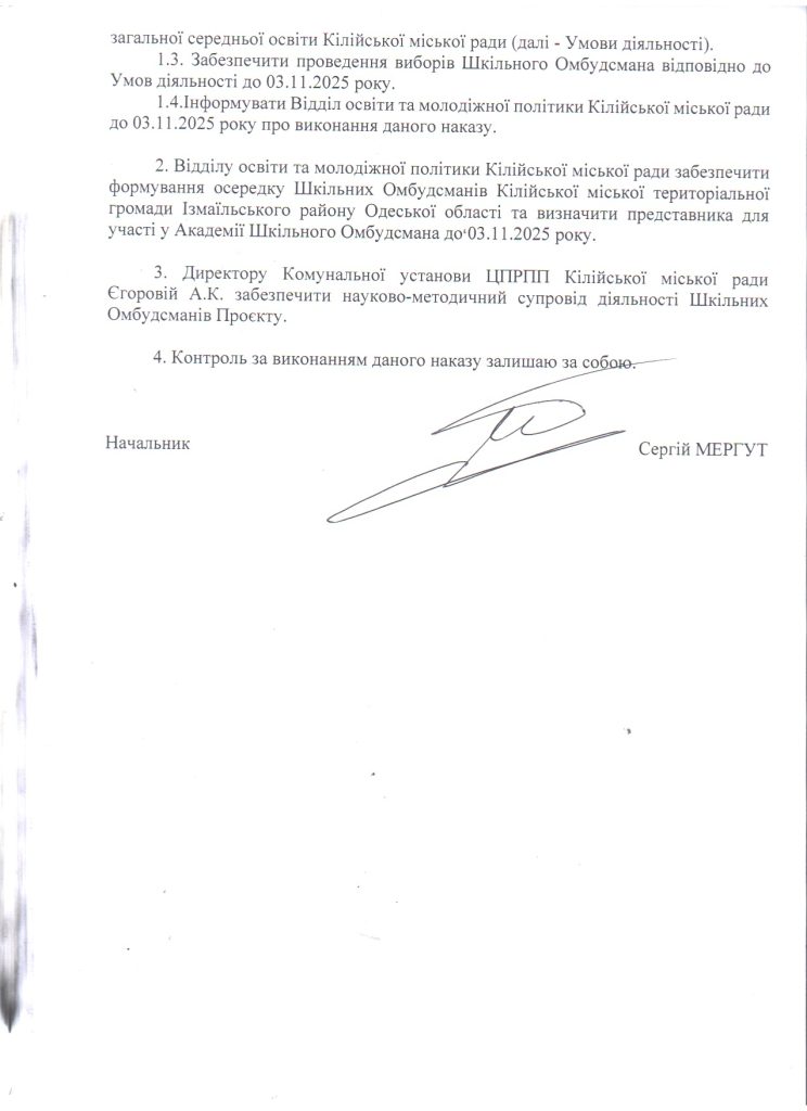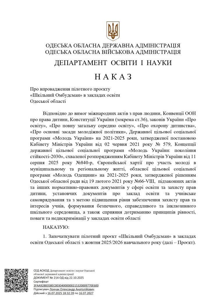 Відділ освіти та молодіжної політики > Новини > Про організацію виконання наказу Департаменту освіти і науки Одеської обласної державної (військової) адміністрації від 22.10.2025 №214-ОД “Про впровадження пілотного проєкту “Шкільний Омбудсман” в закладах освіти Одеської області”