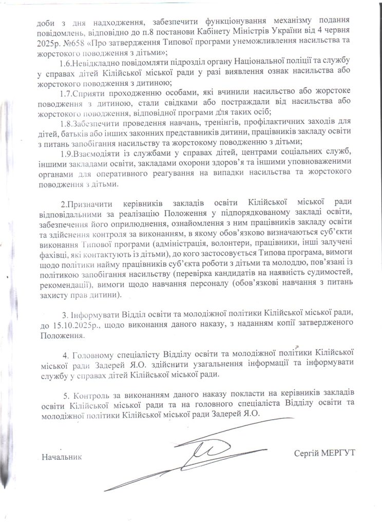 Відділ освіти та молодіжної політики > Новини > Про організацію виконання постанови Кабінету Міністрів України від 4 червня 2025р. №658 “Про затвердження Типової програми унеможливлення насильства та жорстокого поводження з дітьми” в закладах освіти Кілійської міської ради
