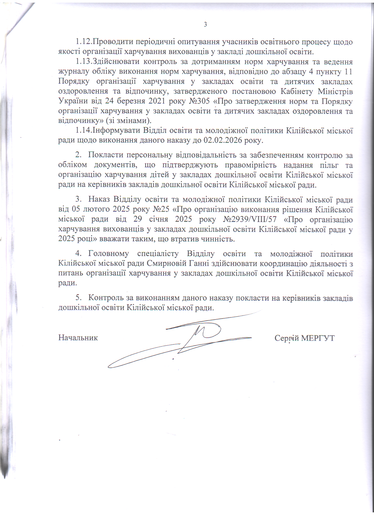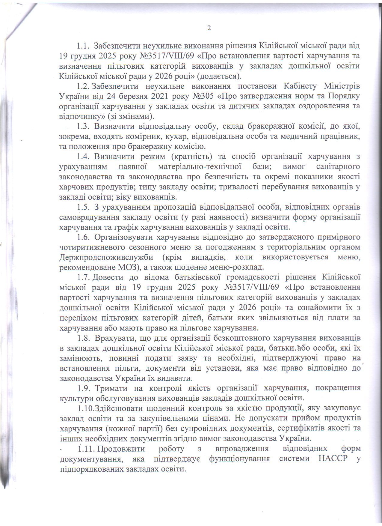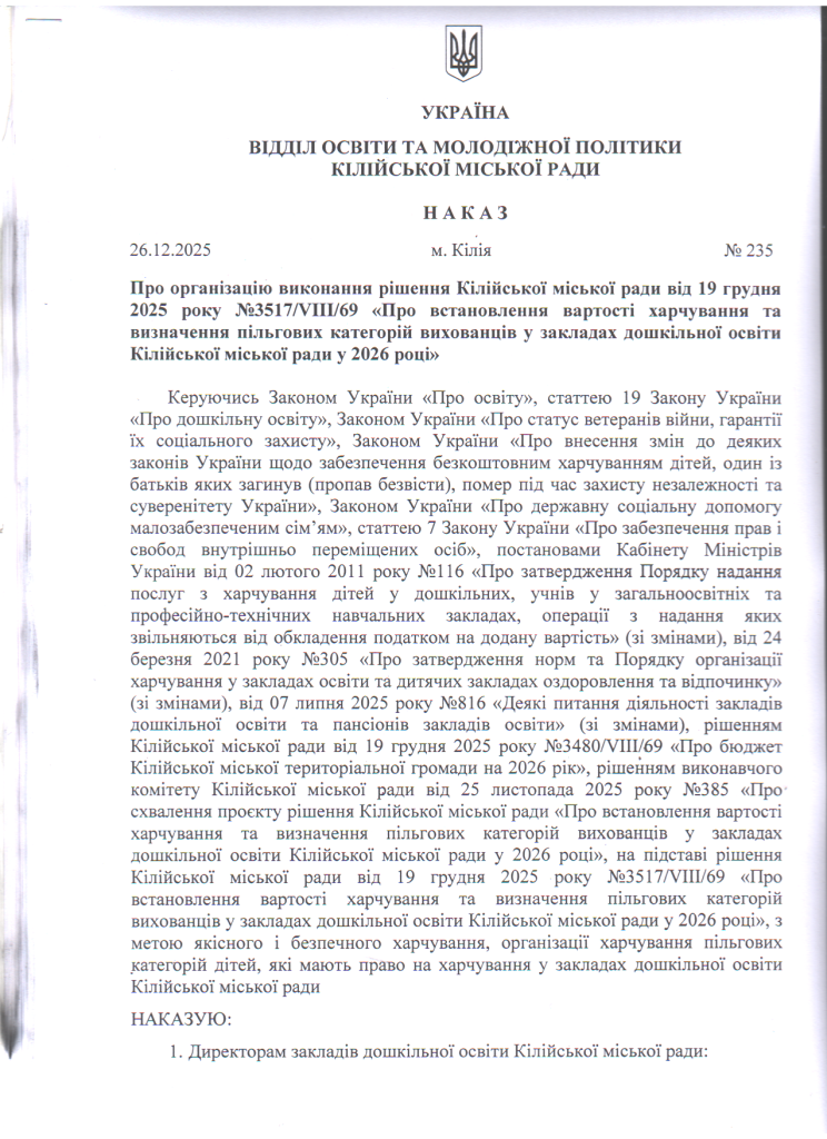 Відділ освіти та молодіжної політики > Новини > Про організацію виконання рішення Кілійської міської ради від 19 грудня 2025 року №3517/VIII/69 «Про встановлення вартості харчування та визначення пільгових категорій вихованців у закладах дошкільної освіти Кілійської міської ради у 2026 році»