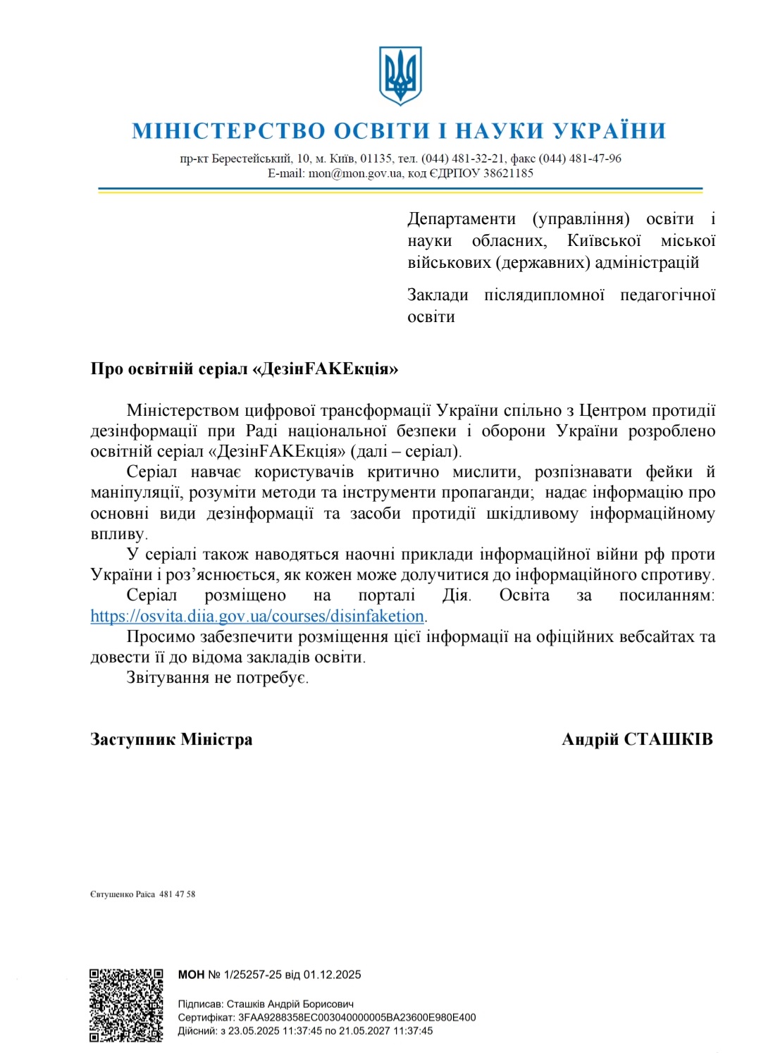 Про освітній серіал “ДезінFAKEкція” 04.12.202504.12.2025 Посилання на серіал: https://osvita.diia.gov.ua/courses/disinfaketion