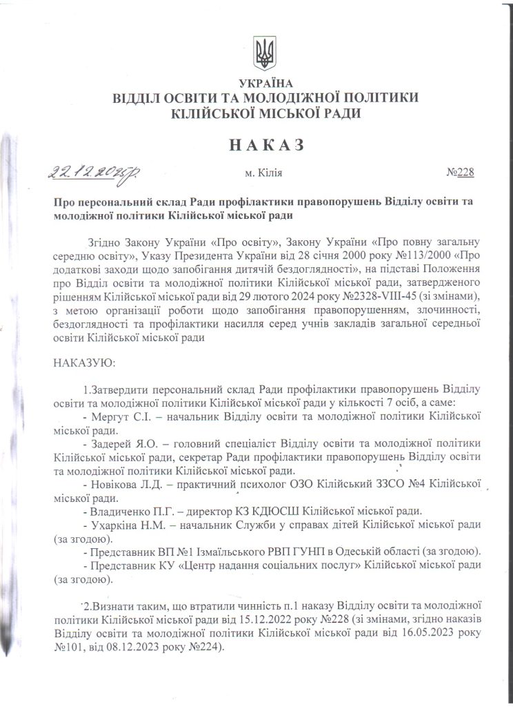 Про персональний склад Ради профілактики правопорушень Відділу освіти та молодіжної політики Кілійської міської ради 23.12.2025