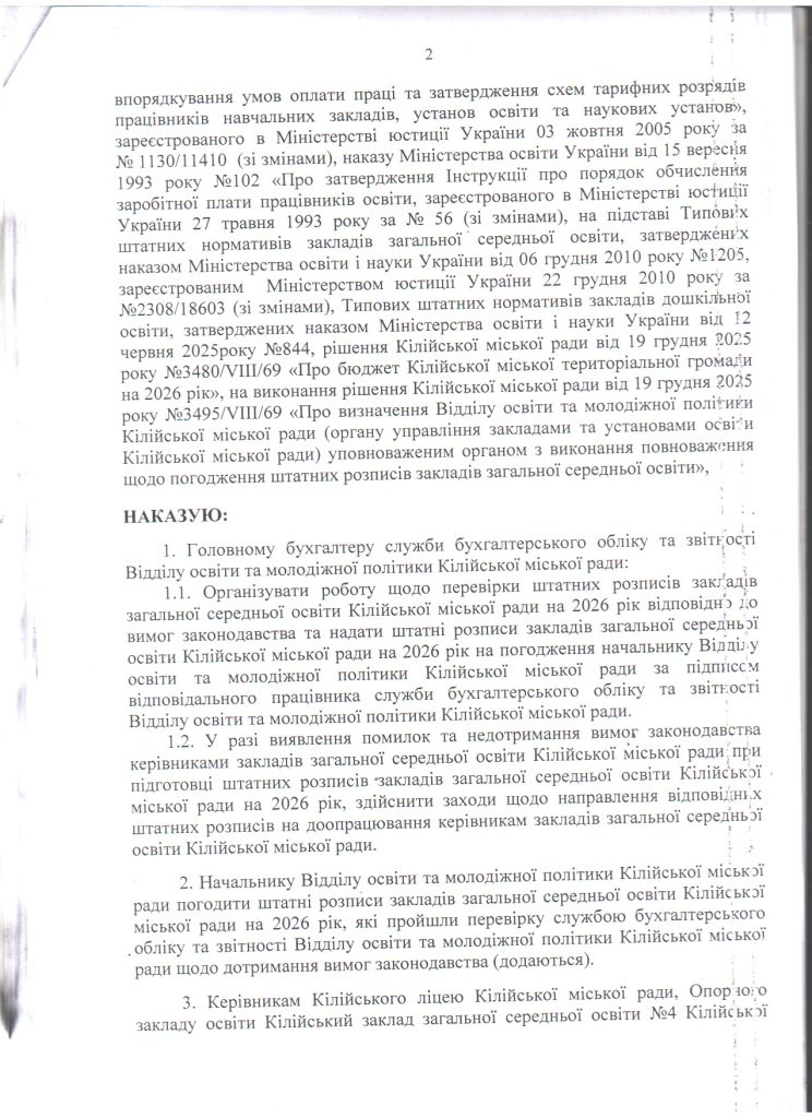 Про погодження штатних розписів закладів загальної середньої освіти Кілійської міської ради на 2026 рік 04.02.202604.02.2026