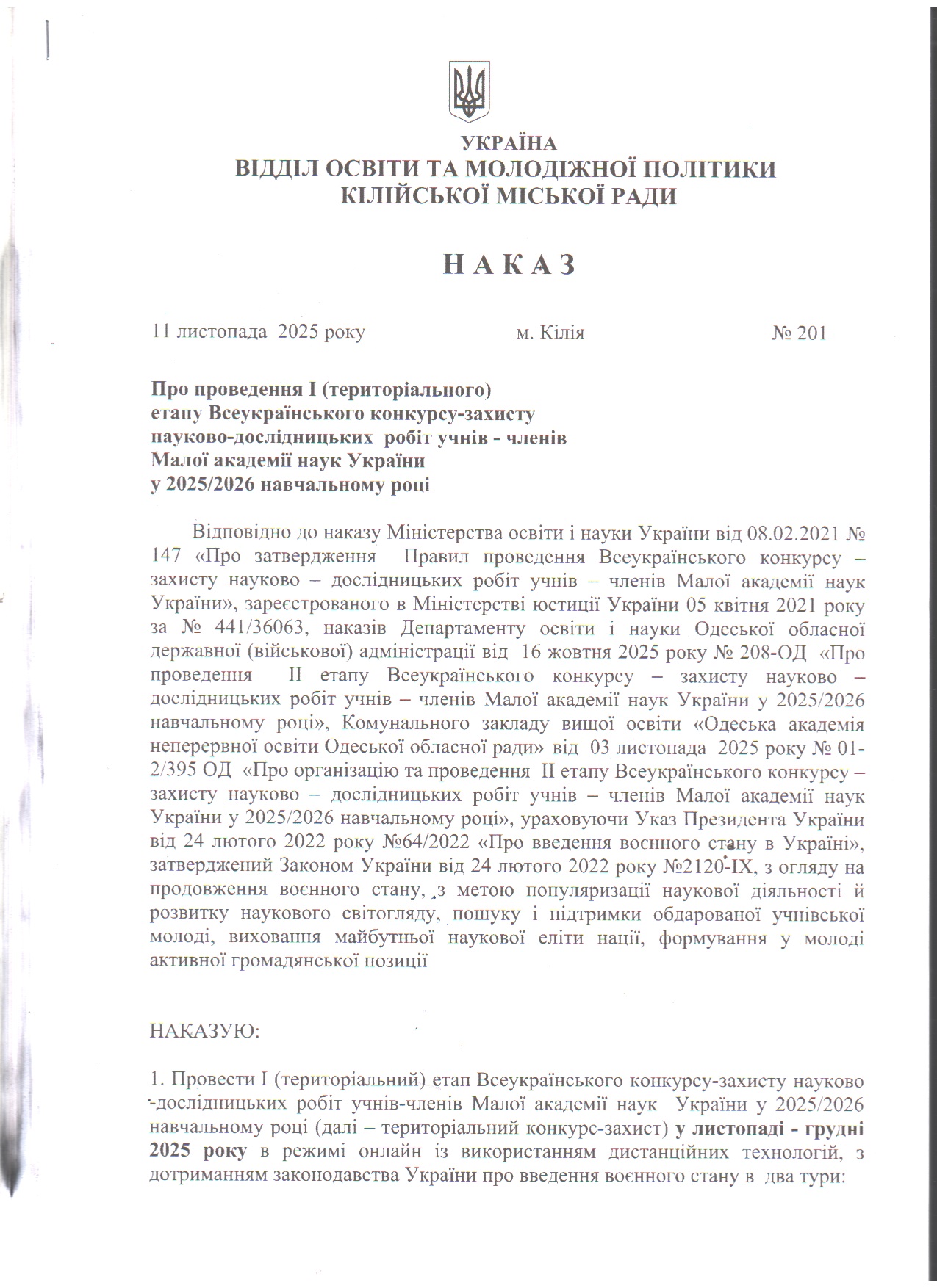 Про проведення І (територіального) етапу Всеукраїнського конкурсу-захисту науково-дослідницьких робіт учнів-членів Малої академії наук України у 2025/2026 навчальному році