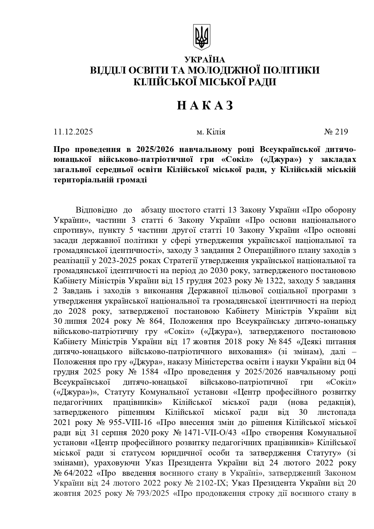 Про проведення в 2025/2026 навчальному році Всеукраїнської дитячо-юнацької військово-патріотичної гри «Сокіл» («Джура») у закладах загальної середньої освіти Кілійської міської ради, у Кілійській міській територіальній громаді