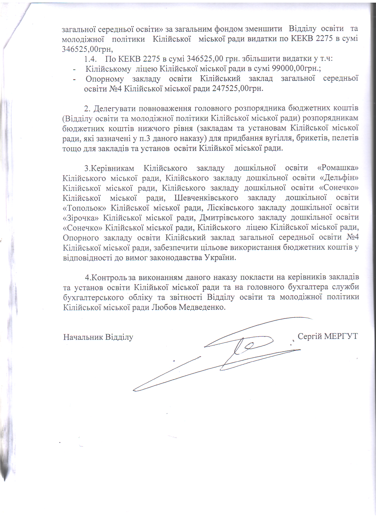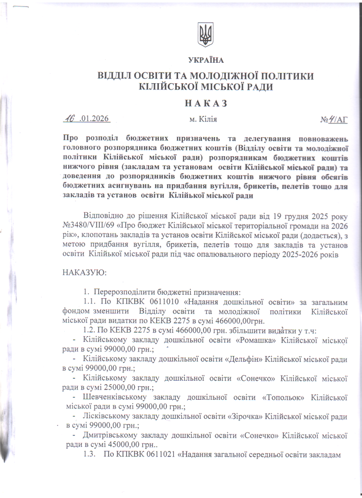 Відділ освіти та молодіжної політики > Без категорії > Про розподіл бюджетних призначень та делегування повноважень головного розпорядника бюджетних коштів (Відділу освіти та молодіжної політики Кілійської міської ради) розпорядникам бюджетних коштів нижчого рівня (закладам та установам освіти Кілійської міської ради) та доведення до розпорядників бюджетних коштів нижчого рівня обсягів бюджетних асигнувань на придбання вугілля, брикетів, пелетів тощо для закладів та установ освіти Кілійської міської ради