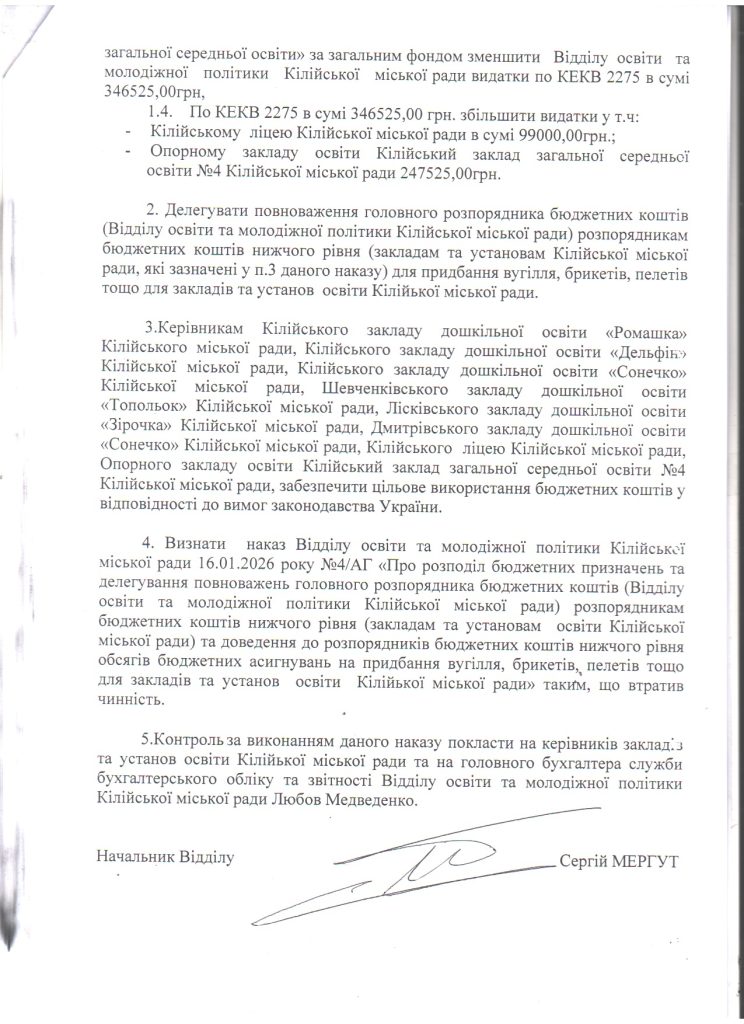 Відділ освіти та молодіжної політики > Без категорії > Про розподіл бюджетних призначень та делегування повноважень головного розпорядника бюджетних коштів (Відділу освіти та молодіжної політики Кілійської міської ради) розпорядникам бюджетних коштів нижчого рівня (закладам та установам освіти Кілійської міської ради) та доведення до розпорядників бюджетних коштів нижчого рівня обсягів бюджетних асигнувань на придбання вугілля, брикетів, пелетів тощо для закладів та установ освіти Кілійської міської ради