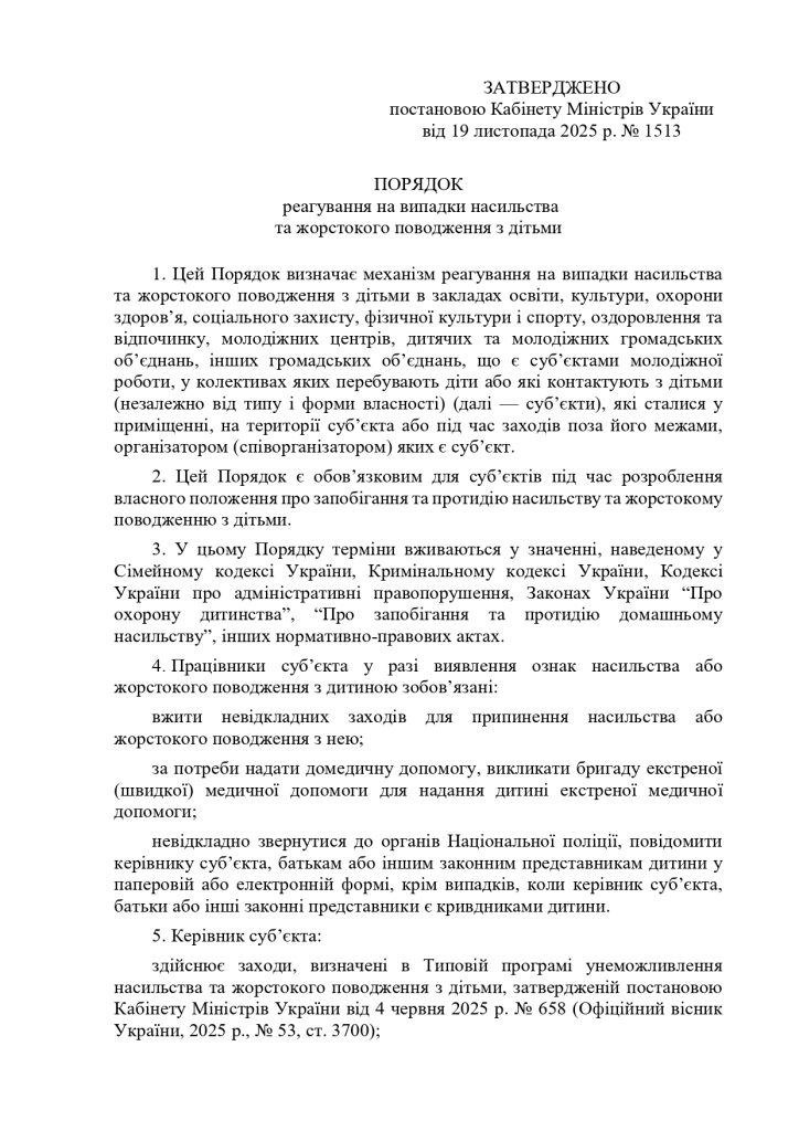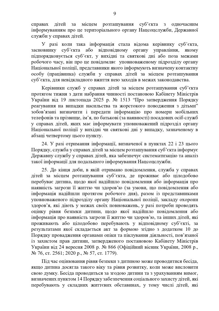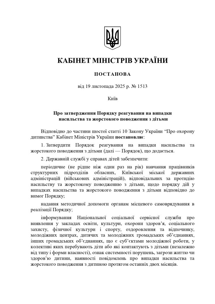Про затвердження Порядку реагування на випадки насильства та жорстокого поводження з дітьми 09.12.202509.12.2025