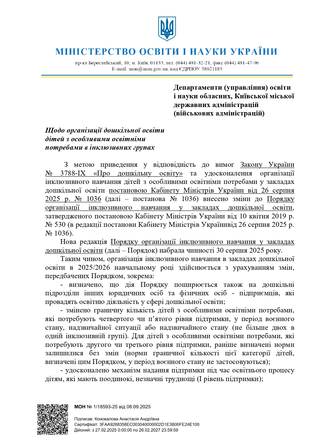 Щодо організації дошкільної освіти дітей з особливими освітніми потребами в інклюзивних групах