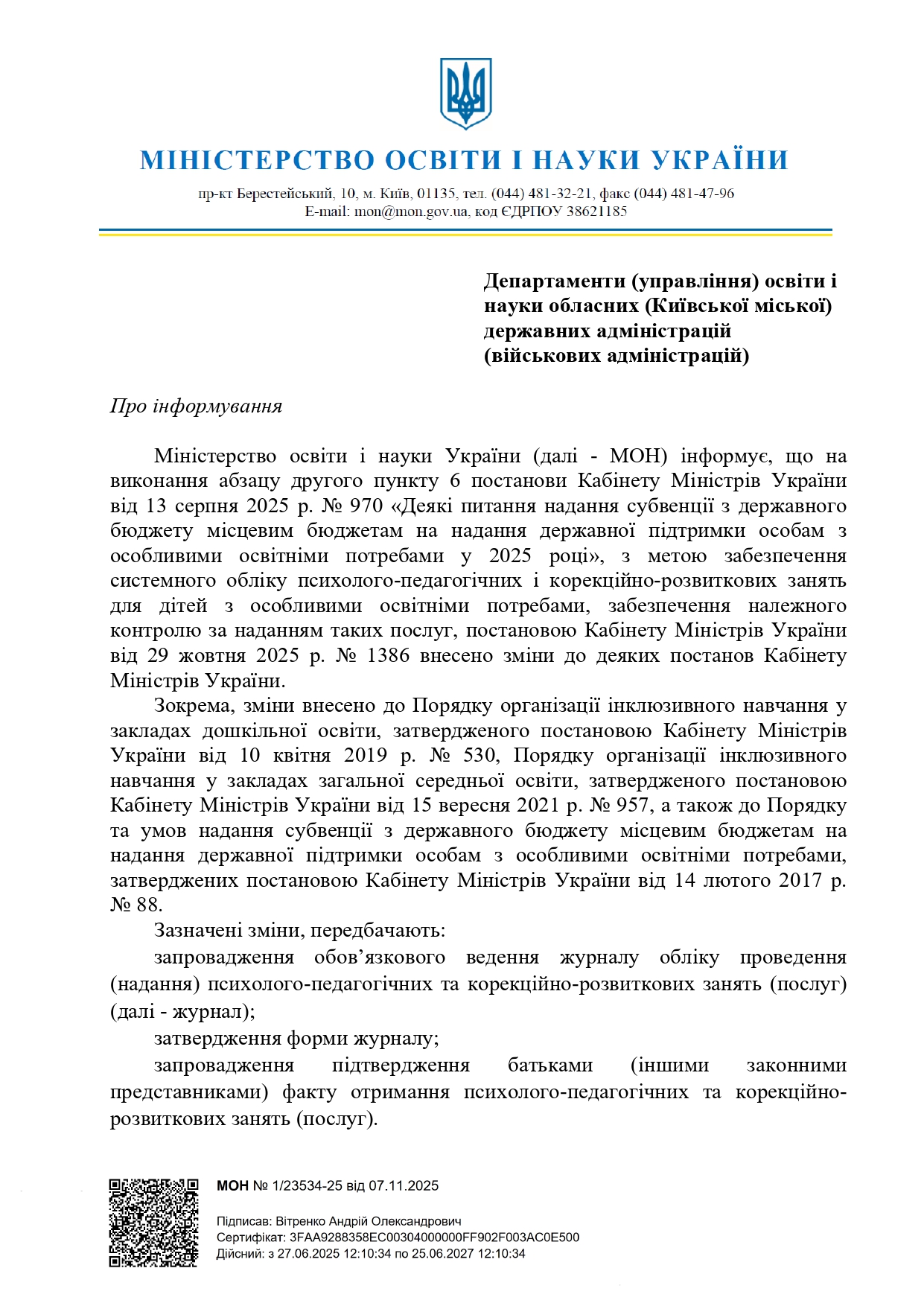 Щодо застосування положень постанови Кабінету Міністрів України від 29.10.2025 року № 1386 у частині обліку психолого-педагогічних і корекційно-розвиткових занять для дітей з особливими освітніми потребами, забезпечення належного контролю за наданням таких послуг, під час організації інклюзивного навчання