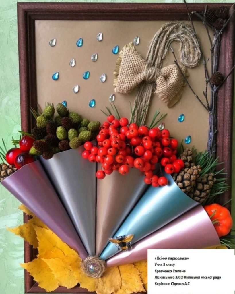 – Кравченко Степан, учень 3 класу Лісківського закладу загальної середньої освіти , назва роботи «Осіння парасолька», керівниця роботи Сіденко Анастасія Сергіївна, практична психологиня;